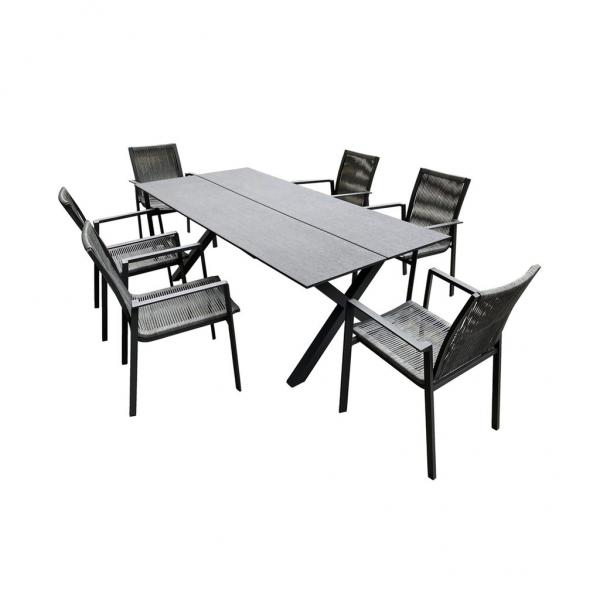 Luxurious set of six chairs and one table made of aluminum profiles with Komaxit finish. The surface of the table is made of highly durable polypropylene. Suitable for exteriors and interiors. Suitable for humid environments. Table dimensions: L 220 × W 100 × H 74 cm. Chair dimensions: L 58 × W 63 × H 89 cm.