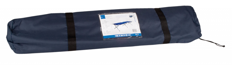 Cloth: 600D polyester/PVC coated frame; polished aluminium foldable and with 3 reinforced crosslegs; size: 189 x 64 x 42 cm. Maximum load 120 kg.