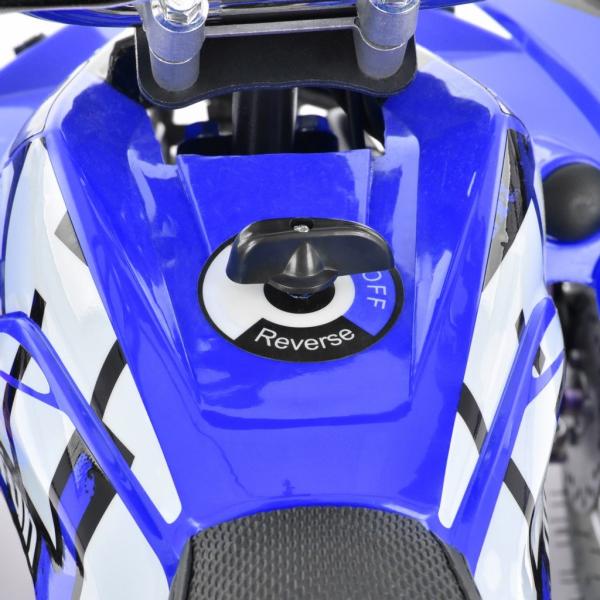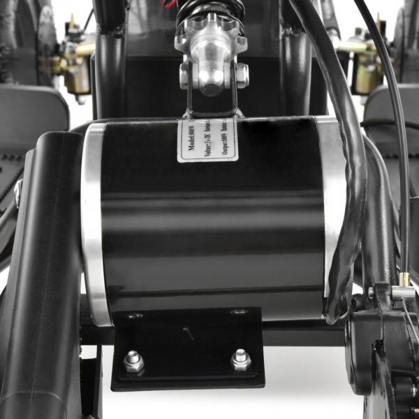 Electric ATV with 800 W engine. Power supplied by 36 V battery with 12 Ah capacity. Metal frame. Speed max. 20 - 25 km/h. Equipped with big 6" wheels. Weight 42 kg. Battery indicator, three speed switch, drive-chain. Max. driving range 13 - 18 km. Charging time 8 -15 hours. Dimensions: length 100 cm x width 59 cm x height 60 cm.