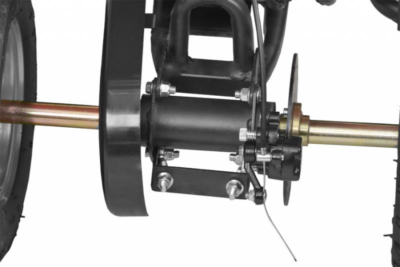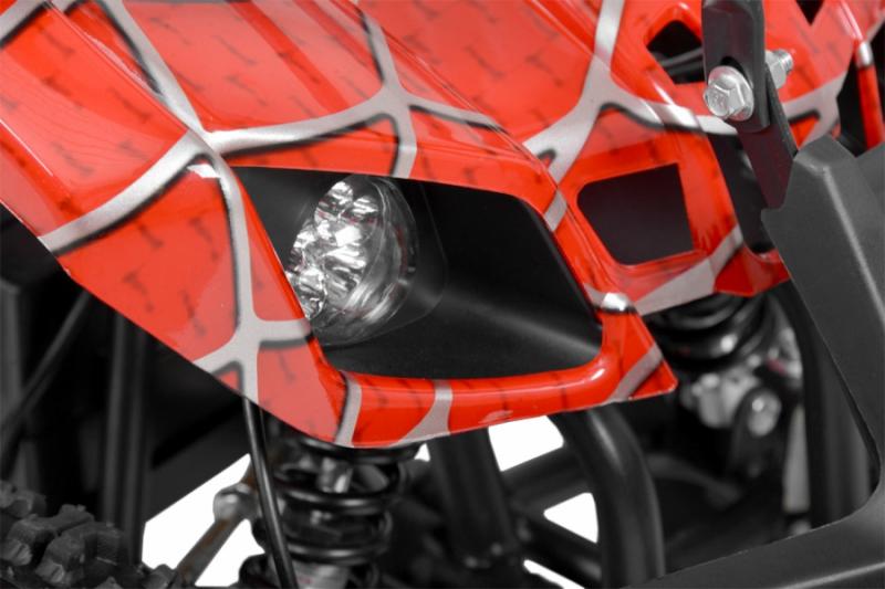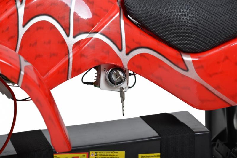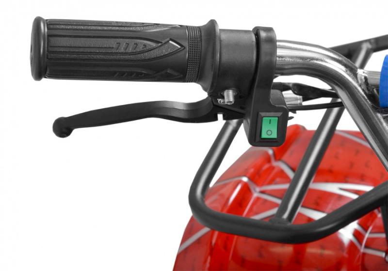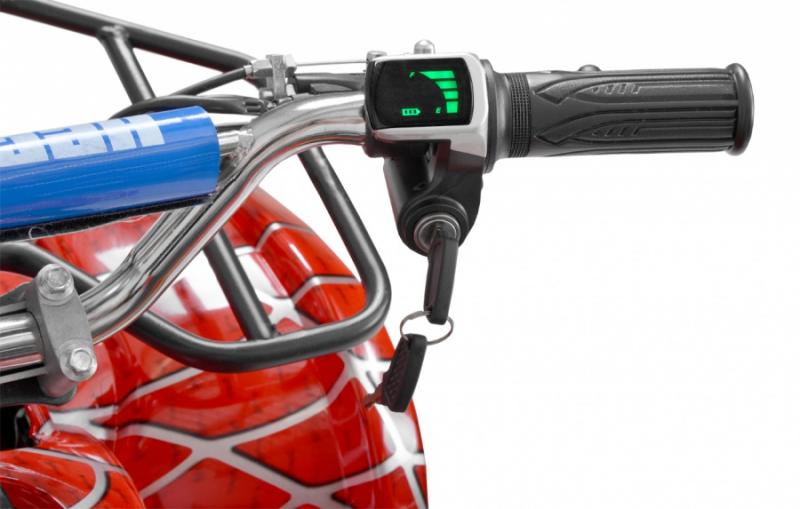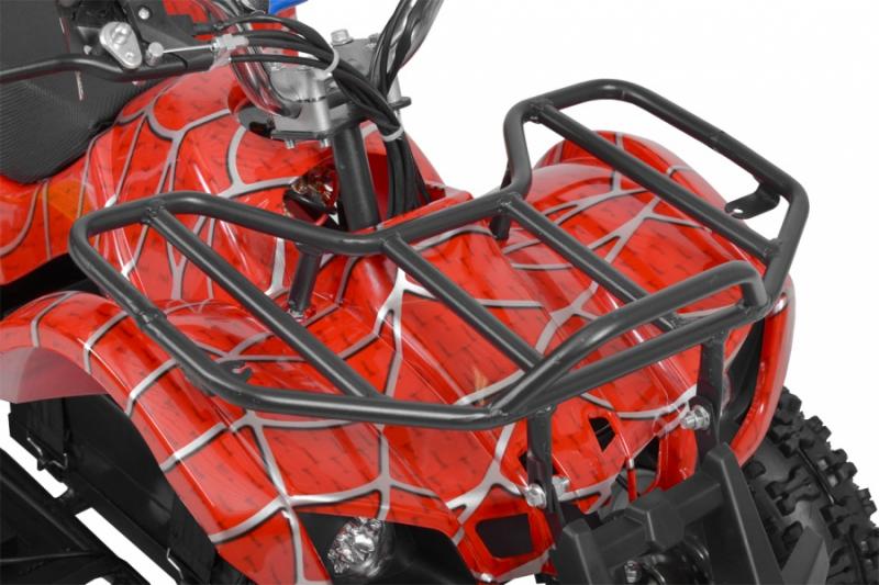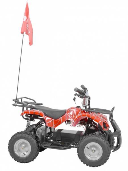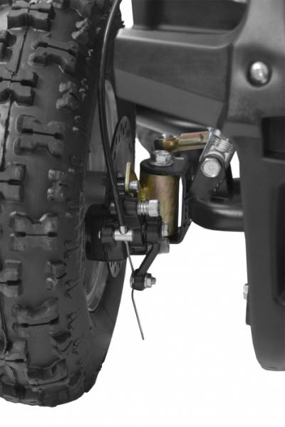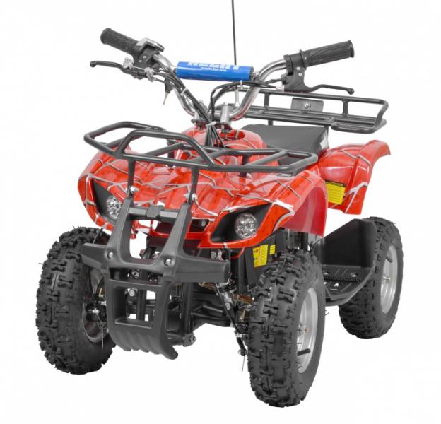 Electric ATV with 800 W engine. Power supplied by 36 V battery with 12 Ah capacity. Metal frame. Speed max. 20 - 25 km/h. Equipped with big 6" wheels. Weight 43 kg. Battery indicator, three speed switch, drive-chain. Max. driving range 13 - 18 km. Charging time 8 hours. Dimensions: length 110 cm x width 59 cm x height 60 cm.
