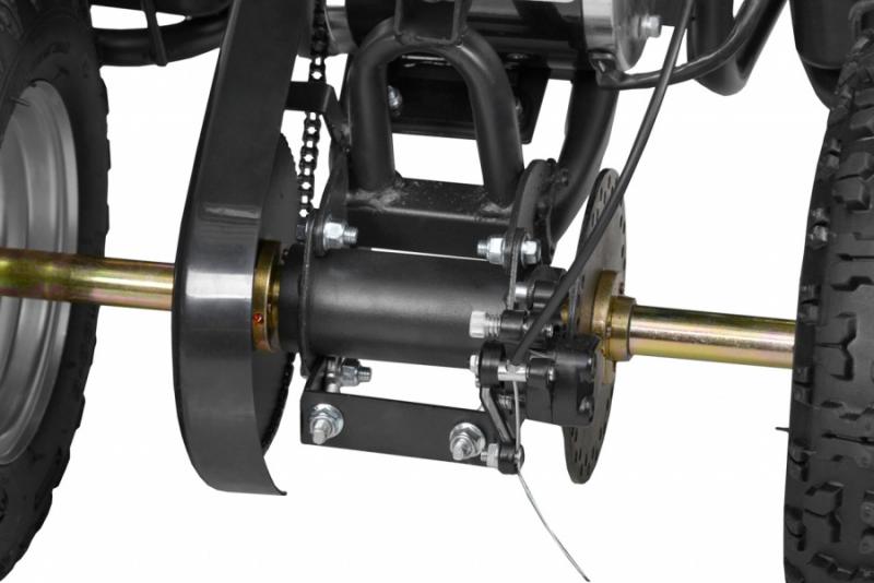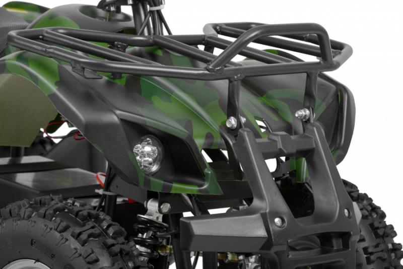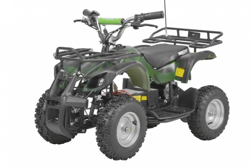 Electric ATV with 800 W engine. Power supplied by 36 V battery with 12 Ah capacity. Metal frame. Speed max. 20 km/h. Equipped with big 6" wheels. Weight 43 kg. Battery indicator, three speed switch, drive-chain. Max. driving range 13 - 18 km. Charging time 8 hours. Dimensions: length 110 cm x width 59 cm x height 60 cm