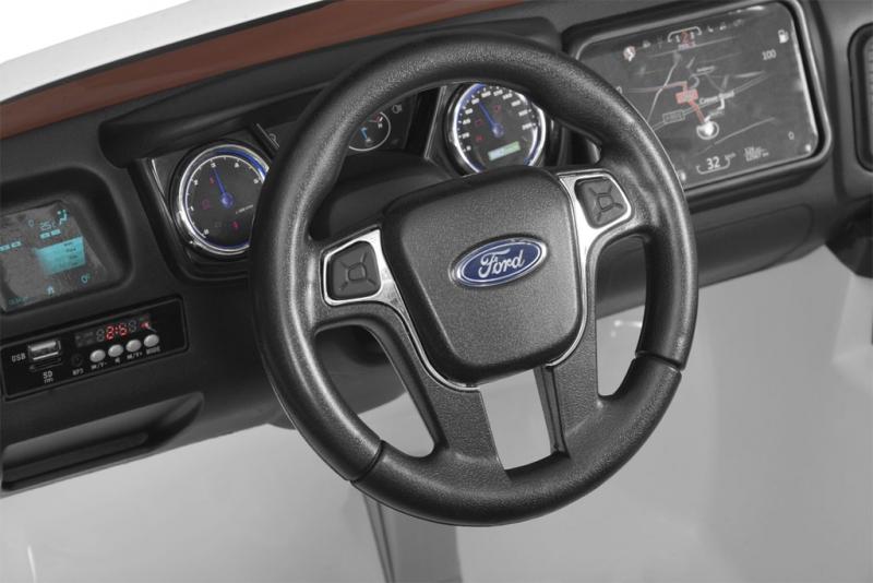 Battery-powered car for children. Suitable for children aged from 3 to 8 years. Maximum load 30 kg. Remote control, reverse, sound and light effects. Rubber covered tires. Original licensed Ford. MP3, USB.