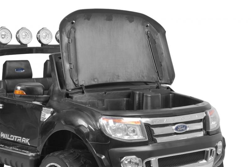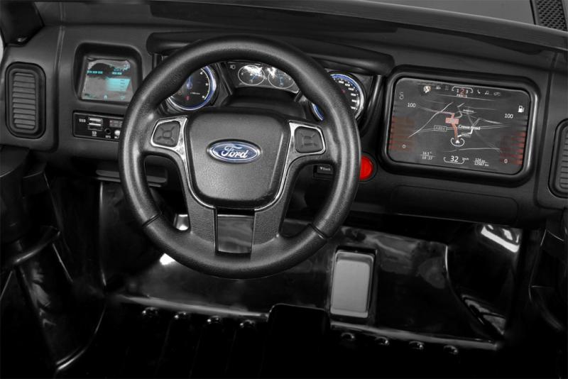 Battery-powered car for children. Suitable for children aged from 3 to 8 years. Maximum load 30 kg. Remote control, reverse, sound and light effects. Rubber covered tires. Original licensed Ford. MP3, USB.