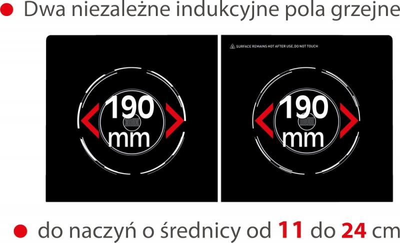 • two independent induction heating zones with a diameter of 190 mm (for utensils with a diameter of 11 to 24 cm)