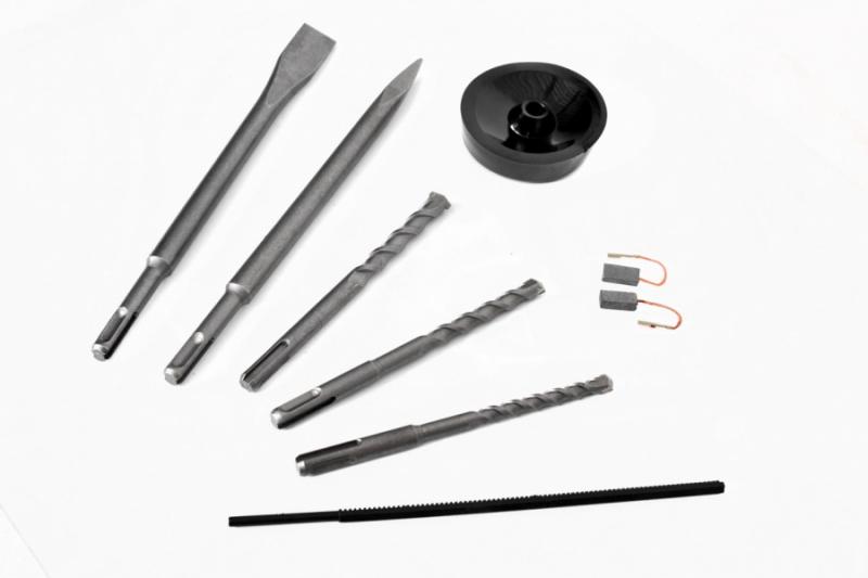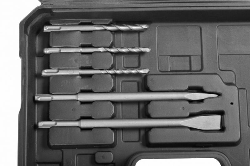 Hammer Drill - 800W. SDS Plus drive, auxiliary handle, depth gauge. Plastic carrying bag, 2 pieces of Chisel and 3 pieces of drill bits (12 x 150/14 x 160/16 x 250 mm) included.