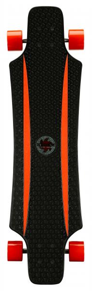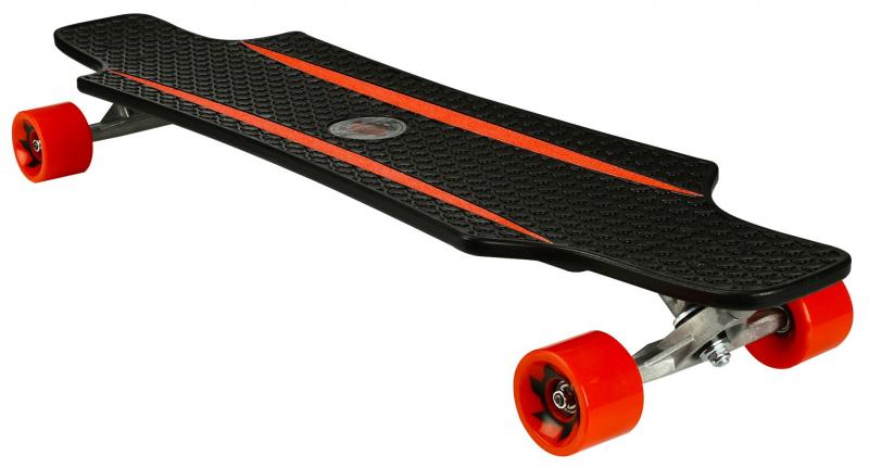 High-grade, plastic 36 inch dropthrough deck, integrated reinforcement ribs, integrated grip profile, alu heavy duty truck with PU cushioning, top-mount axl montage, ABEC 7 bearings, PU spoke wheels size 70 x 51 mm. Smooth, highly comfortable riding properties, flexible hi-impact deck, excellent curve/carve capacity. Dimension ca. 91.5 x 23 cm.