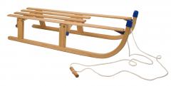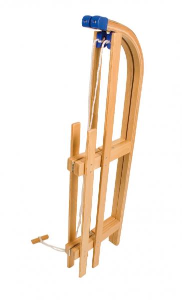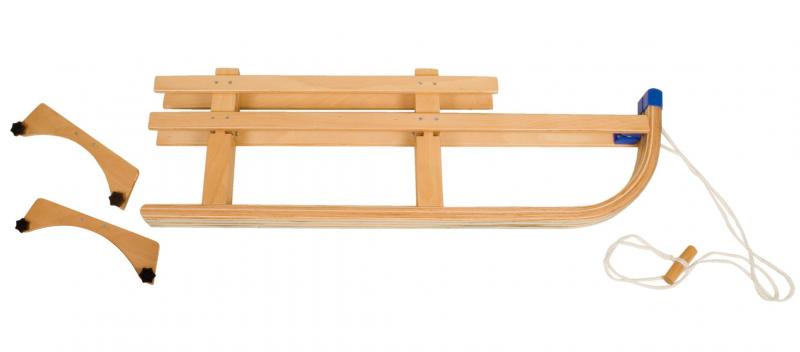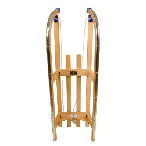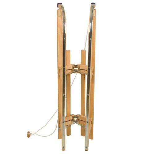 Beech/poplar wooden sledge with patented wooden folding system and stainless steel screws, bolts, nuts and gliders, protection caps for extra safety, including pulling rope with wooden grip. Dimension: folded up only 110 x 35 x 9 cm. Lenght 110 cm. Colour: beech.
