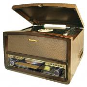 Wood Retro Style FM-Radio with Turntable, Cassette, CD Player and Direct Encoding. Programmable CD Player, MP3, CD-CDR-CDRW; 33/45/78 rpm Turntable, autostop; FM Analog Tuner; Autostop Cassette Mechanism; USB/SD/MMC Encoding, Playback, Copy, Delete; Nominal Output Power (RMS) – 2x2W; Digital LED Display for CD Function; Remote Control; Colour Versions Wood; Power supply 230V AC; Weight 7,25 Kg; Dimensions (WxHxD) 402x275x340 mm