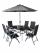 Combined garden furniture set of 6 chairs and one table with parasol. Steel-Aluminium frame profiles, table with black tempered glass. Suitable for sheltered garden areas.
