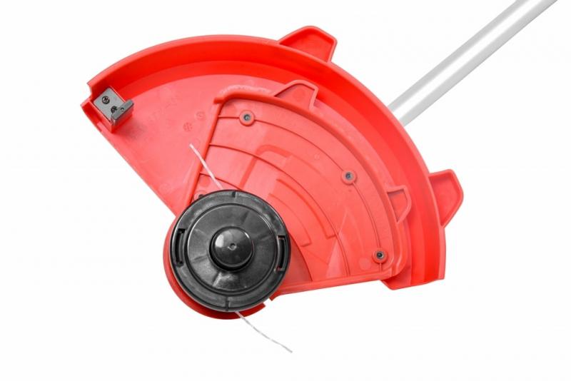 The brushcutter-trimmer holder is intended for use with Multifunctional battery drive unit HECHT 1441 only. The working width of the trimmer head is 300 mm and the working width of the metal knife is 254 mm.