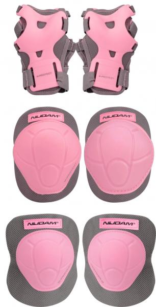 Rulluisutaja kaitsmete komplekt: randme-, põlve- ja küünarliigestele. Materjal: 3-D EVA vaht õhukanalitega, välispind kaetud kõrge löögitaluvusega PP kattega. Värvus: must/roosa. Suurus L. (L = jalanumber 33-35)
