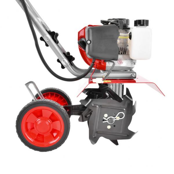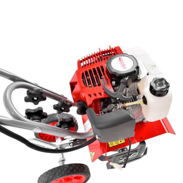 2-taktiline bensiinimootor HECHT OHV 51,7 cm3, edasi käik, võimsus: 2.0 hj. Töölaius: 25 cm. Freesi terad :4 tk. Kaal: 14,5 kg.