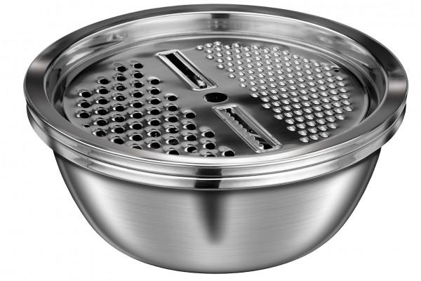 Стальная чаша с набором терок и съемным дуршлагом САК-6 — практичный и функциональный набор, который пригодится на любой кухне. Состоит из стальной чаши, дуршлага и крышки с терками для мелкого и крупного измельчения и нарезки (плоскими и зубчатыми).