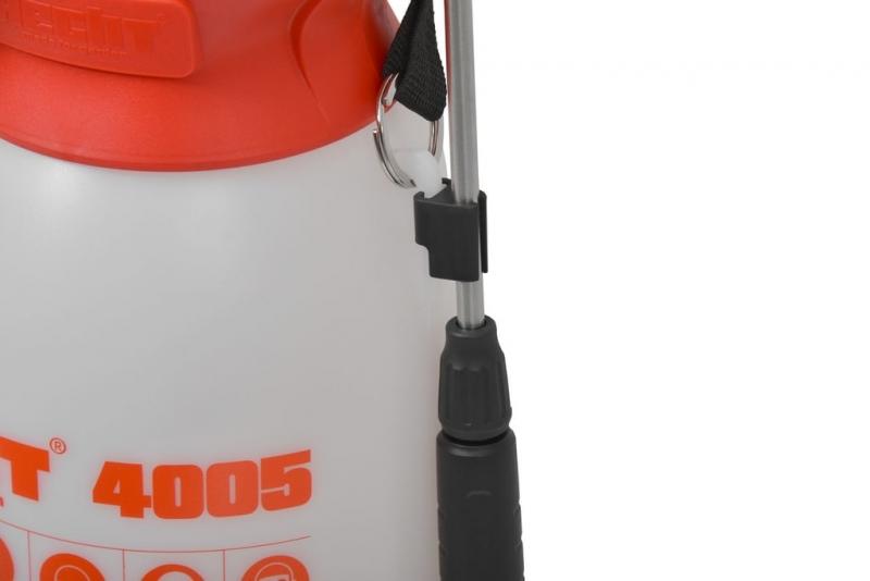 Напорный опрыскиватель на батарейках. Телескопическая трубка с насадкой (длина до 60 см). До 120 минут на одном заряде. Максимальное давление 2 бар. Бак 5л. Вес 1,1 кг. Емкость аккумулятора 2,5 Ач. Приблизительное время зарядки 240 мин. Благодаря регулируемой форсунке распыление является точным. Он подходит для обработки отдельных растений, а также для использования на небольших площадях.