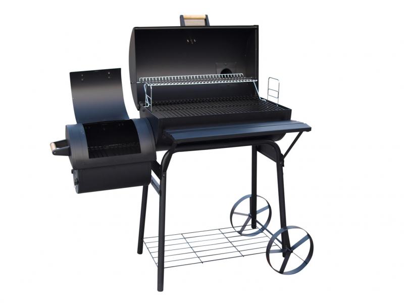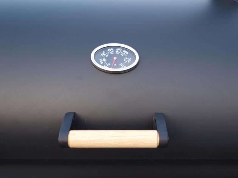 Grill from the sheet-steel is protected against undesirable effects with heat-resistant black ink. Two heating chambers, three cooking areas, thermometer.