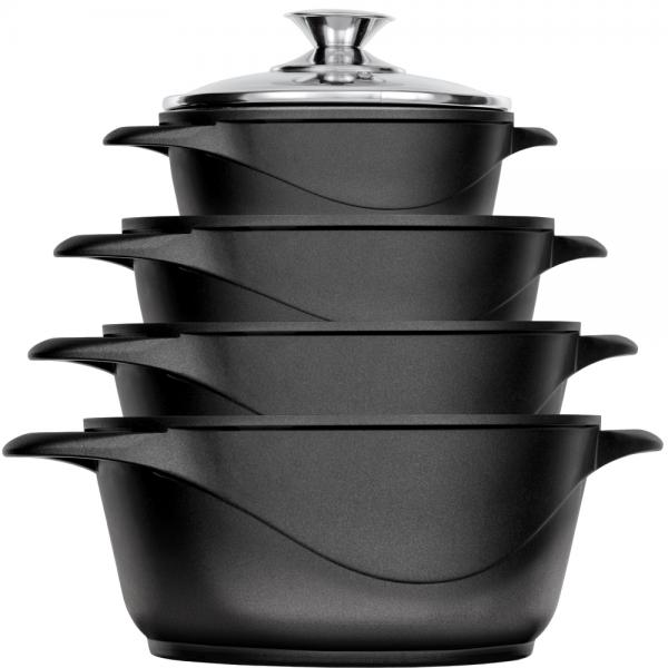 • Набор содержит: кастрюля с крышкой 16см - 1,5л, кастрюля с крышкой 20см - 3,5л, кастрюля с крышкой 24см - 5,5л, кастрюля с крышкой 28см - 8л, cиликоновые рукавицы - 2 шт.