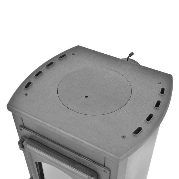 Камин с задним выходом для дымохода, подходит для использования в помещении и мастерской. Дверь чугунная с жаропрочным стеклом, прочный стальной корпус. Духовка облицована шамотом, который продлевает срок службы печи и в то же время собирает тепло. Решетка чугунная.