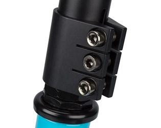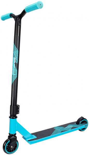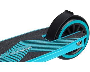 Frame - aluminium, heavy duty steel, strong improved rectangular frameconstruction, deck - aluminium with griptape, handles - rubber, non-foldable, detachable handlebar with rubber grips with ends with impact protection, triple fixation collar, steel flex-brake at rear, 85A PU spoke wheels (100 x 24 mm), ABEC 7 bearings, a maximum load of 100 kg. Weight ca. 4 kg. Dimension: deck - 48 x 10.5 cm. Height: handlebar - 83 cm (not in height adjustable).