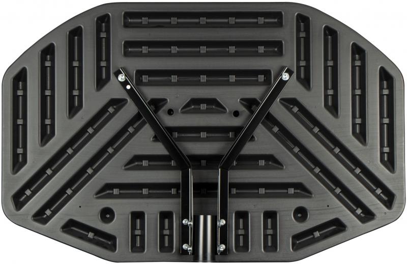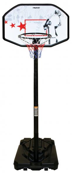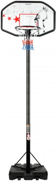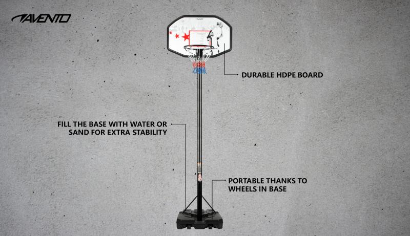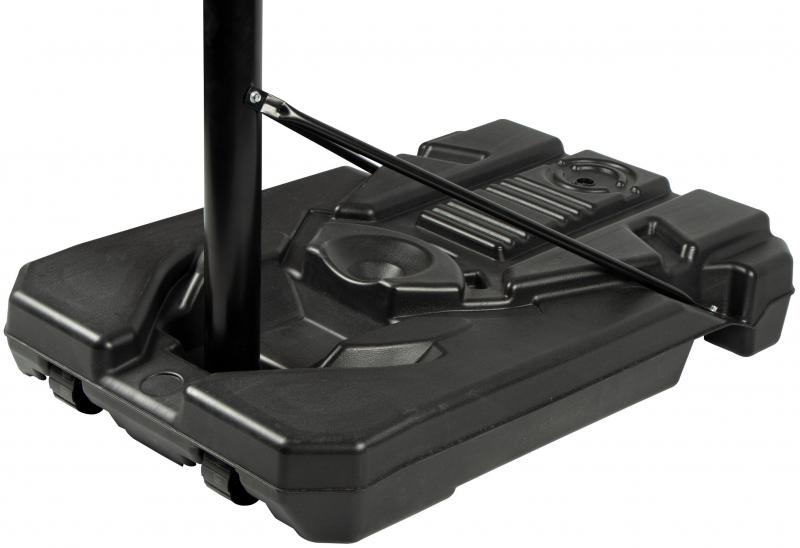 Model: basketball frame adjustable in height, basket height between about 200 cm to a maximum app. 305 cm, metal rod is attached to the base with two additional clamping bars, the plastic base can be filled with sand or water for stability, easy movability at certain angle using sturdy built-in wheels, hexagonal board with on top and bottom rounded corners, for indoor and outdoor use, including assembling and adjustment instructions