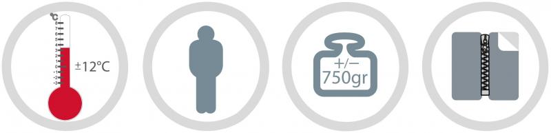 Quality 190T polyester. Lining TR Polycomfort. Filling 100% hollow fibre silicone polyester 225 gr/m². Comfort rate: ca. 12 degrees Celsius. Model envelope style - water-repellent, blanket-shaped, can be twinned, dividable polyamide zipper. Dimension 140 x 70 cm. Carry bag including.