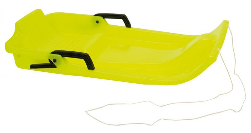 100% polyethylene. Model: cast plastic sledge with brake and pulling rope, stackable. Dimension: 83 x 42 cm. Colour: yellow.
