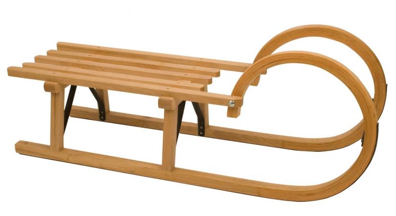 Quality: Lacquered beech wood with stainless steel gliders. Model: classic wooden curl at the front, metal connectionrod at the front to attach the pulling cord (art. 0269) This sledge complies with the latest TÜV requirements! Length 95 cm. Colour: Blanc.